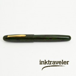 The Eboya Ricchiku Kaze Green Medium fountain pen features a marbled green-blue and black ebonite body inspired by the shape of upright bamboo. Crafted without a clip for a smooth silhouette, it is equipped with a 14K gold nib and uses an international cartridge/converter filling system. Each piece is unique, with marbling patterns varying from pen to pen.