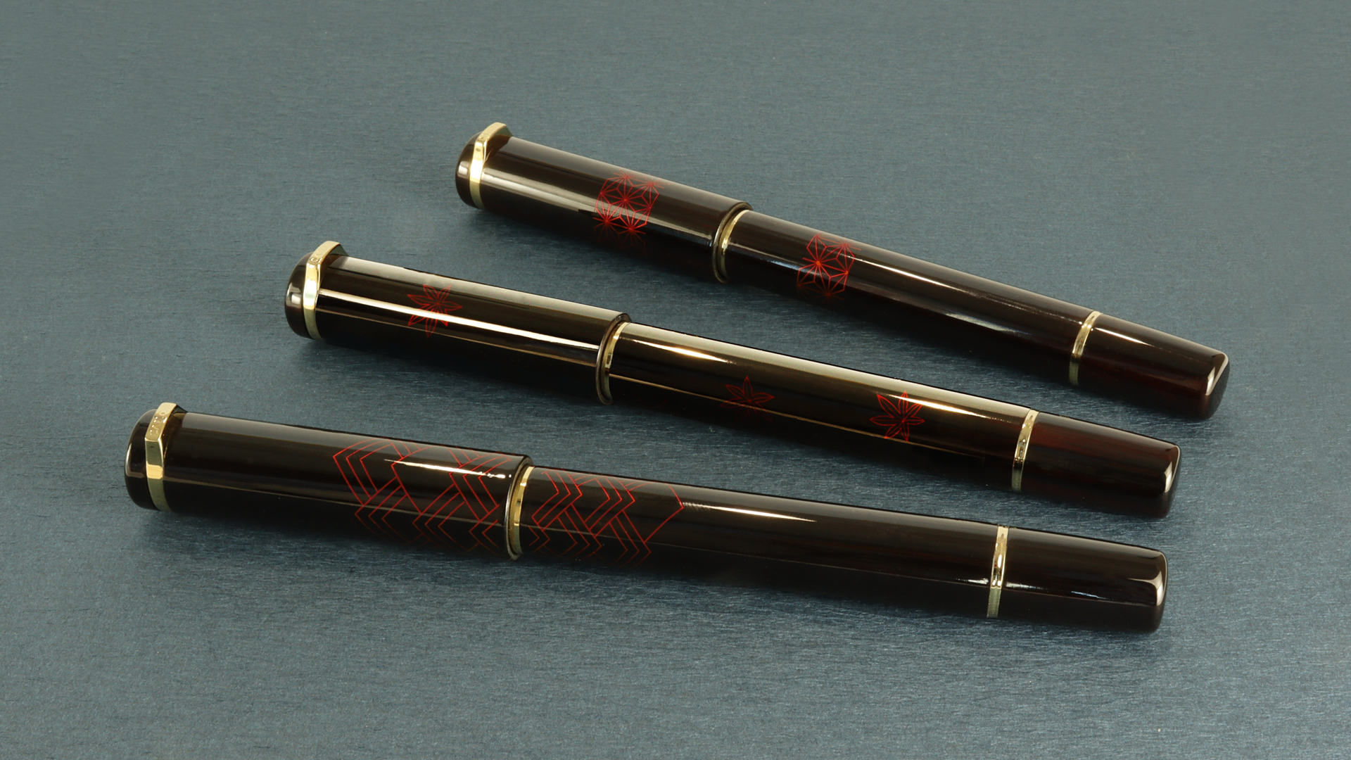 Sobre este trabajo se aplica una capa de laca urushi translúcida que aporta un tono rojizo profundo y genera un efecto visual de gran profundidad, permitiendo que el oro aparezca y desaparezca según la luz. El capuchón, sin clip, incorpora una discreta pestaña antivuelco que evita que la pluma ruede sobre la mesa, reforzando la funcionalidad sin alterar la pureza estética del conjunto.